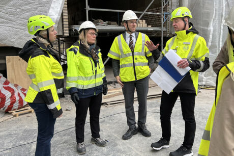 Från vänster Katarina Swedenborg, projektchef SKB, Ingrid Gyllfors, vd SKB, Andreas Carlson, bostads- och infrastrukturminister och Johan Jarding, fastighetsutvecklingschef SKB. Foto: SKB/Henrik Betnér