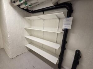 Återbrukshyllor uppsatta i källaren mellan Olof Gjödingsgatan 9-11.