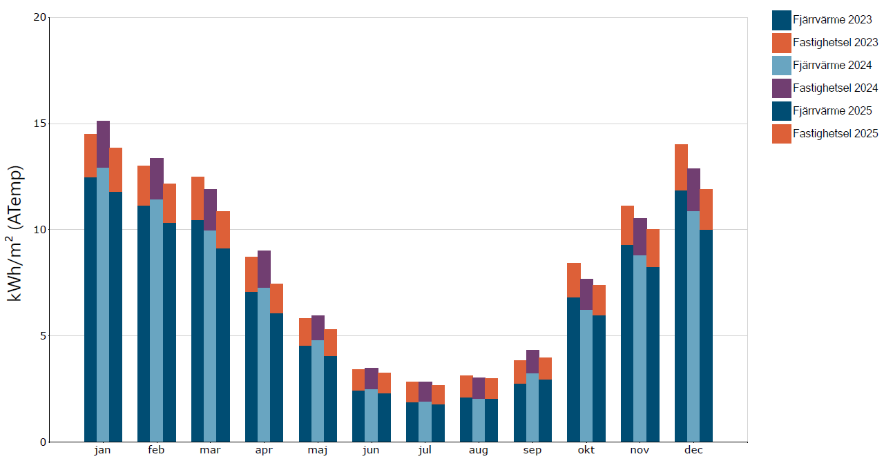 Här nedanför kan du se hur SKBs totala energi- och varmvattenanvändning sett ut 2025 jämfört med 2023 och 2024. (Hushållsel ingår inte.) Förklaringar till statistiken och de begrepp som används nedan hittar du längst ner på sidan.