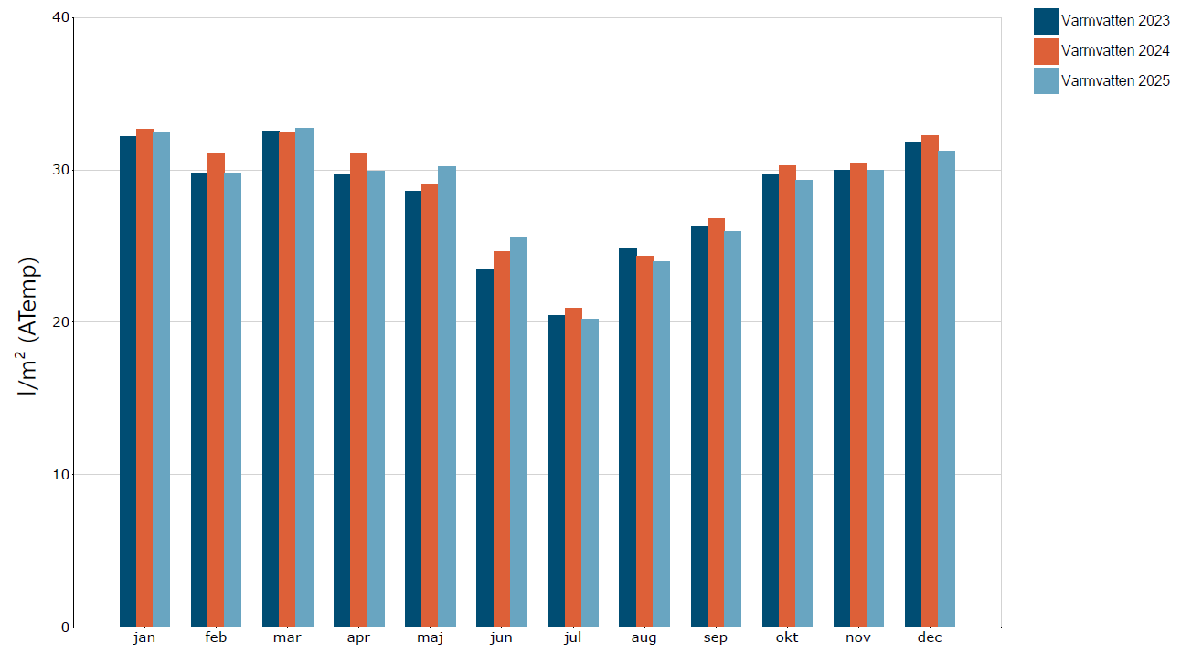 Här kan du se rapporten för SKBs totala varmvattenanvändning (liter) per yta (m2 Atemp).