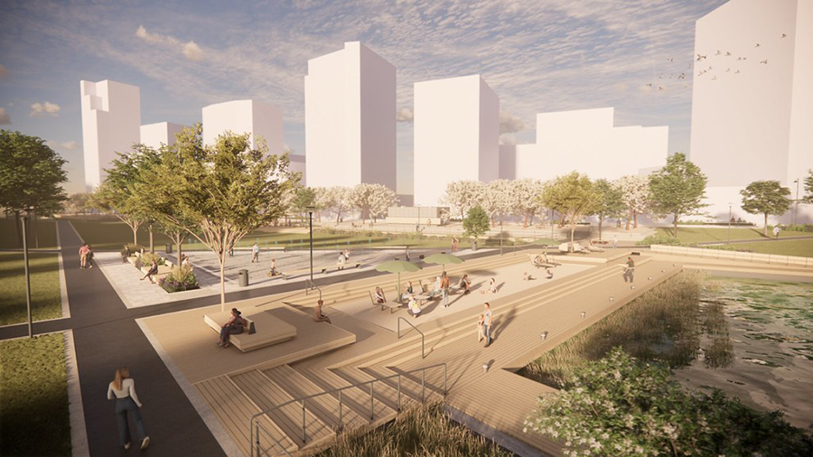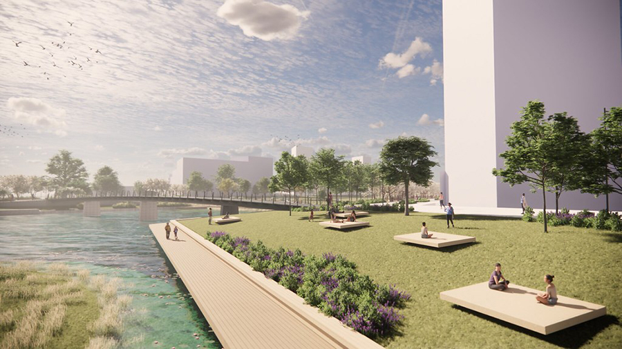 Parkbryggan som löper längs med dammen och som redan idag är färdigbyggd. I bakgrunden ser vi den västligaste av de nya broarna och bakom den stadsdelsparken.